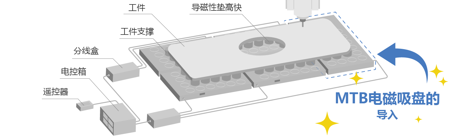 另外、电磁吸盘的操作只需要一个按键即可操作、5台电磁吸盘可以使用一条电线控制。装夹时间也从原来的15分钟虽短至3分钟。