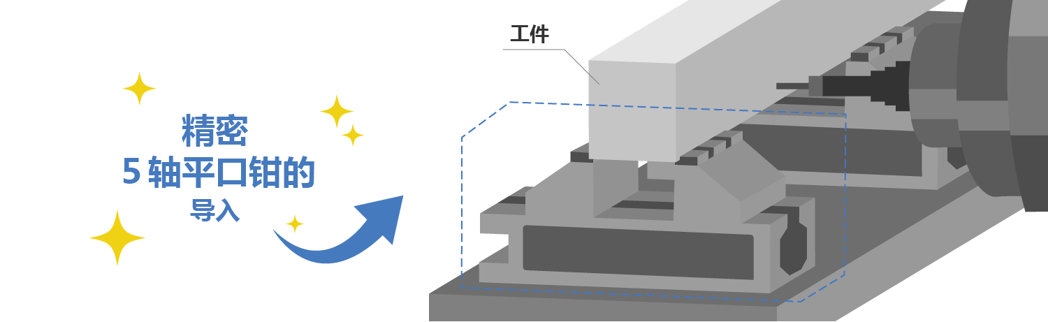 导入使用适用范围广的5轴 LT5AU100虎钳、同专门夹具相比、费用减少。因为可以适应于各种工件加工、所以都可以稳定夹紧工件。同时也便于保管和护养。